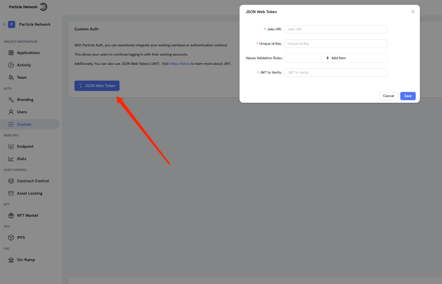 within this configuration object to authenticate your Particle Auth instance properly. Additionally, you can apply customizations to the wallet modal for a tailored user experience.